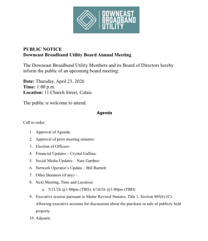 This months meeting will be held at the Calais City Building.